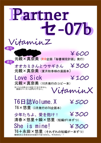 個人誌が一冊(R18)と秋季さんとの合同本(全年齢)が一冊。 両方とも秋季さんが表紙を描いてくださることになりました……ヒョオオオ 表紙詐欺にならないよう中身も頑張ります^▽^ というかうちの本でR18って誰得すぎるww 実質5日間であわせて約40P(コピー本の書き直し含む)仕上げる必要があると昨日の打ち合わせで知って若干泣きそうです^^^^ それと卒論も同時並行というか明らかにこっちが優先なんで、場合によっては個人誌を落とす覚悟です。 でも、そろそろ本当に個人誌でオフ出したいんで落としたくない……!! 来年のオフ活動についてですが、一月か二月の乙女系オンリーに出た後はイベント参加は自粛する予定です。 四月以降は新社会人なので、流石に最初はそっちに専念しようかと思ってます。 受かるかどうかは別にして、夏コミは申し込むかもしれませんw オフ活動はちょっと縮小になりますが(もともとそんなに活発に活動してませんが)、サイト縮小とかそういうことではありません。 ビタミンの二次はオンオフともに当分続けたいと思ってます。 そして……牧場物語のSSをそろそろサイトに移したい……というか牧場物語でオフ活動したry PR 久しぶりに体調を崩してしまい、ベッドの住人と化していました。 スパークに参加された方々、お疲れ様でした! 当日はとんでもない本を発行してしまい……本当にすまないと思っているっ! しかし、事前にいただいていたサンプル画像からイラストそのものは既に目にしていたというのに……ポスター・本・ノベルティの三連コンボは相当な腹筋破壊力でした。 これが……日緒さんとアズさんの本気……!!! プチオンリー開催の準備でご多忙の中、企画本に多大なご尽力をいただきましたお二人に心より感謝申し上げます。 また、貴重なイラスト・小説原稿・漫画原稿をご寄稿下さいました執筆者の方々にもこの場を借りて改めて御礼申し上げます。 当サークルが発行元ではありますが、今回ご協力いただきました方々のどなたが抜けても企画本の発行は実現しなかったと思います。 何回御礼を申し上げても感謝の念はつきません…! また、当日に企画本をお手にとってくださった方々にも感謝申し上げます。 ぶっちゃけ、あまりにもぶっとんだコンセプトのお祭り本だったので「ドン引かれて日本各地の元親スキーを敵に回したらどうしよう…!!」とわりと本気で心配していたのですが、意外と皆さんああいうのがお好きなようで(笑) 予想よりも遥かに沢山の方にお手にとっていただけて嬉しかったです。 企画本の残部は冬に持ち込みますので、よろしくお願い致します! あ、冬といえば、秋季さんと元親×真奈美で合同本を出すことになりました……!!ヒエエエエ 全世界の元親スキーもとい秋季さんファンを敵に回すこと必至で本当に恐れ多いのですが、滅多に無い機会なのでありがたくお言葉に甘えさせていただくことにしました>< でもあまりに申し訳ないので最初に謝っておきますね。 本当に……すまないt(ry 冬は個人誌でももう一冊出す予定です。 こっちも元親本(10月発行のコピー本再録&書き下ろし)にする予定なのですが……R18になりそうなんですよね;; でもコミケで年齢指定本の新刊を出すと色々めんどうなことになるって聞いたのでちょっと……うーん。 あと、コミケに提出された見本誌が全て某大学の図書館に納められることになるらしいと聞いてガクガクしております^^; オフ関係の話が続いているのでついでにお知らせなんですが、通販を当面休止します。 卒論と原稿に集中したいので……申し訳ありません。 再開は来年一月を予定しています。 当日、イベントやアフターでお相手して下さった方々ありがとうございました! なんか……今回は既刊の感想をいただく機会が凄く多くて、本当に嬉しかったです。 (SNSでいつも名前を拝見していた方々に「本持ってます^^」って言われた時はギャアアアアアア恥ずかしくて死にたい!!!!ってなりましたが…!特に、あの、まさか、清春&瞬の本に一言いただけた時はどうしようかと…!!ほんと残念クオリティですいませn) 沢山の差し入れや素敵なイラストカードもいただいてしまいまして、凄く嬉しかったです! あと、ドラマCD効果もあったのか、いつもよりT6本をお手にとって下さる方も多かったように思います。 T6好きな方々とおしゃべりする機会にあまり恵まれないので、「このお客さん、T6好きなんだ……!」と勝手にそわそわしていました。 挙動不審で申し訳ないです。 それと、もう一つ非常に申し訳ないことがあるんですが… 当日はシールラリーのことをご存じない方が結構多くて、そのたびにご案内させていただいてたんですが、どうも私主催様サークルの位置を全然違う方向だと思い込んでて、場所を聞かれた時にとんちんかんな案内をしてしまっ……て……orzorzorz も、もう、本当に申し訳ないです……;; そっちは壁サークルじゃなくてシャッターだよ!!っていう。 「お前のせいで迷子になったじゃね